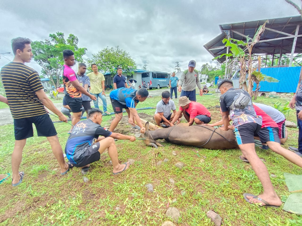 Usai pelaksanaan salat Idul Adha, kemudian dilanjutkan dengan penyembelihan hewan kurban oleh jajaran Lanal Timika yakni 3 ekor sapi dan 2 ekor kambing untuk dibagikan kepada masyarakat yang membutuhkan.