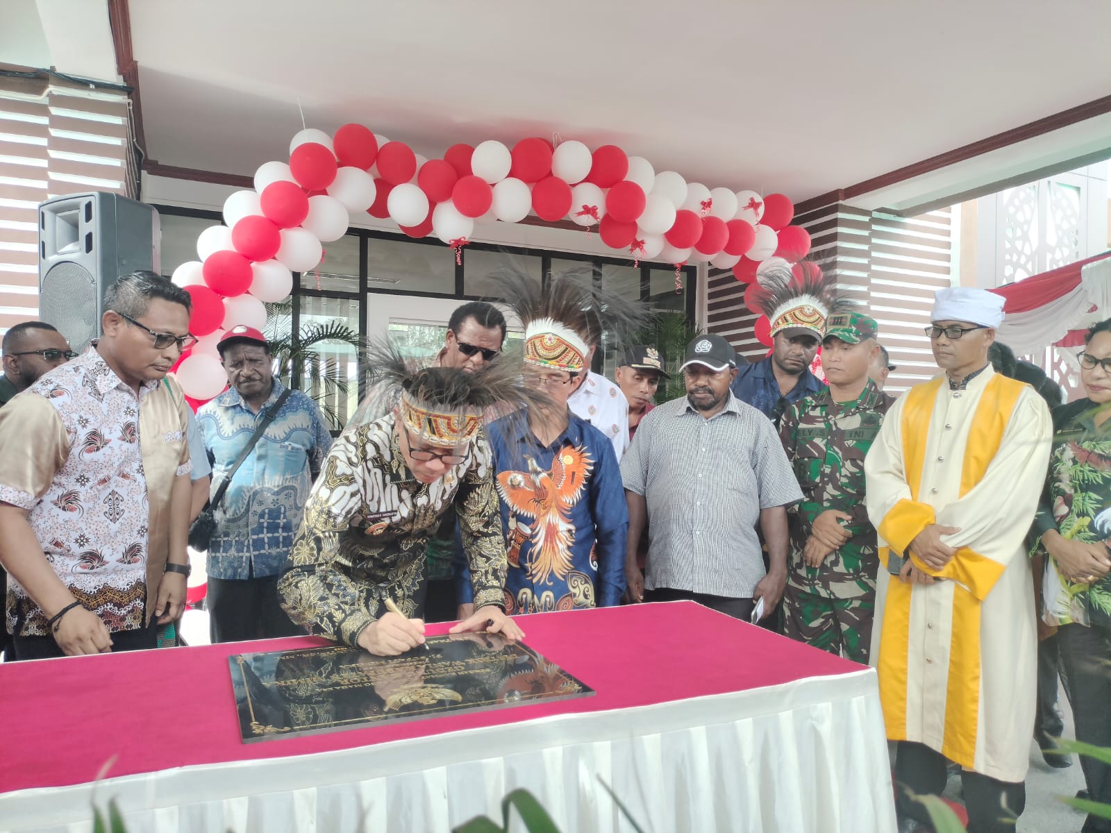TIMIKA, pojokpapua.id — Gedung baru Kantor Distrik Wania diresmikan penggunaannya oleh Penjabat (Pj) Bupati Mimika, Yonathan Demme Tangdilintin, pada Kamis (27/2/2025). Peresmian ini ditandai dengan penandatanganan prasasti dan pemotongan pita di pintu masuk gedung baru.